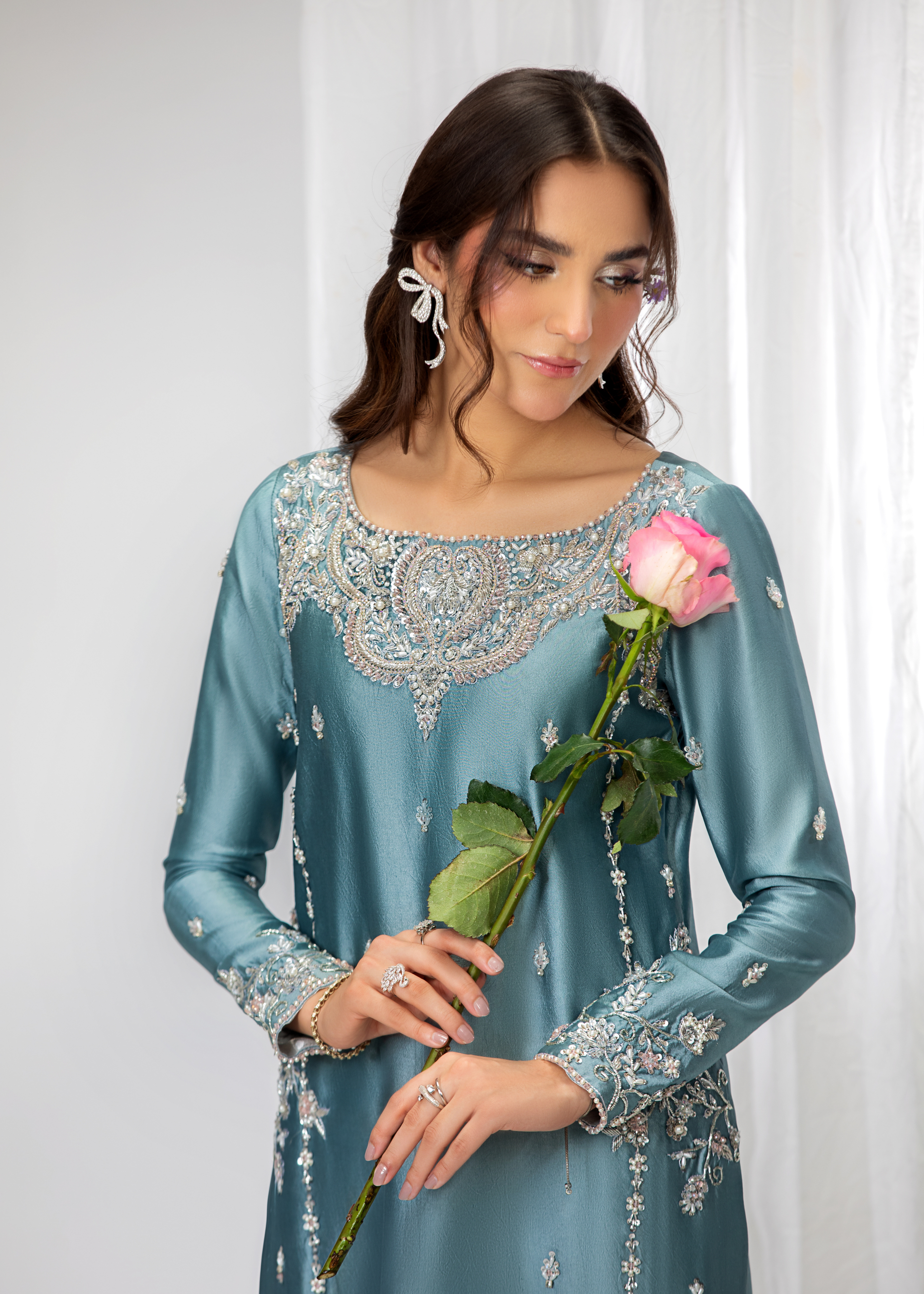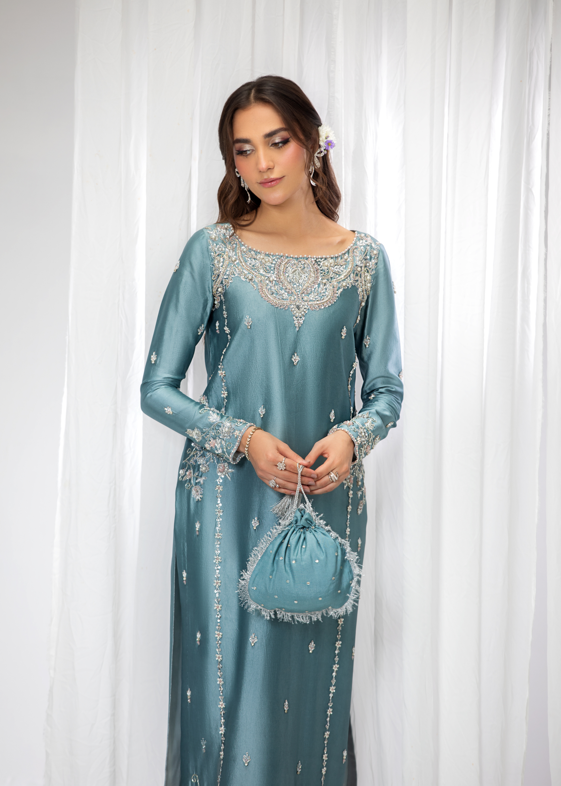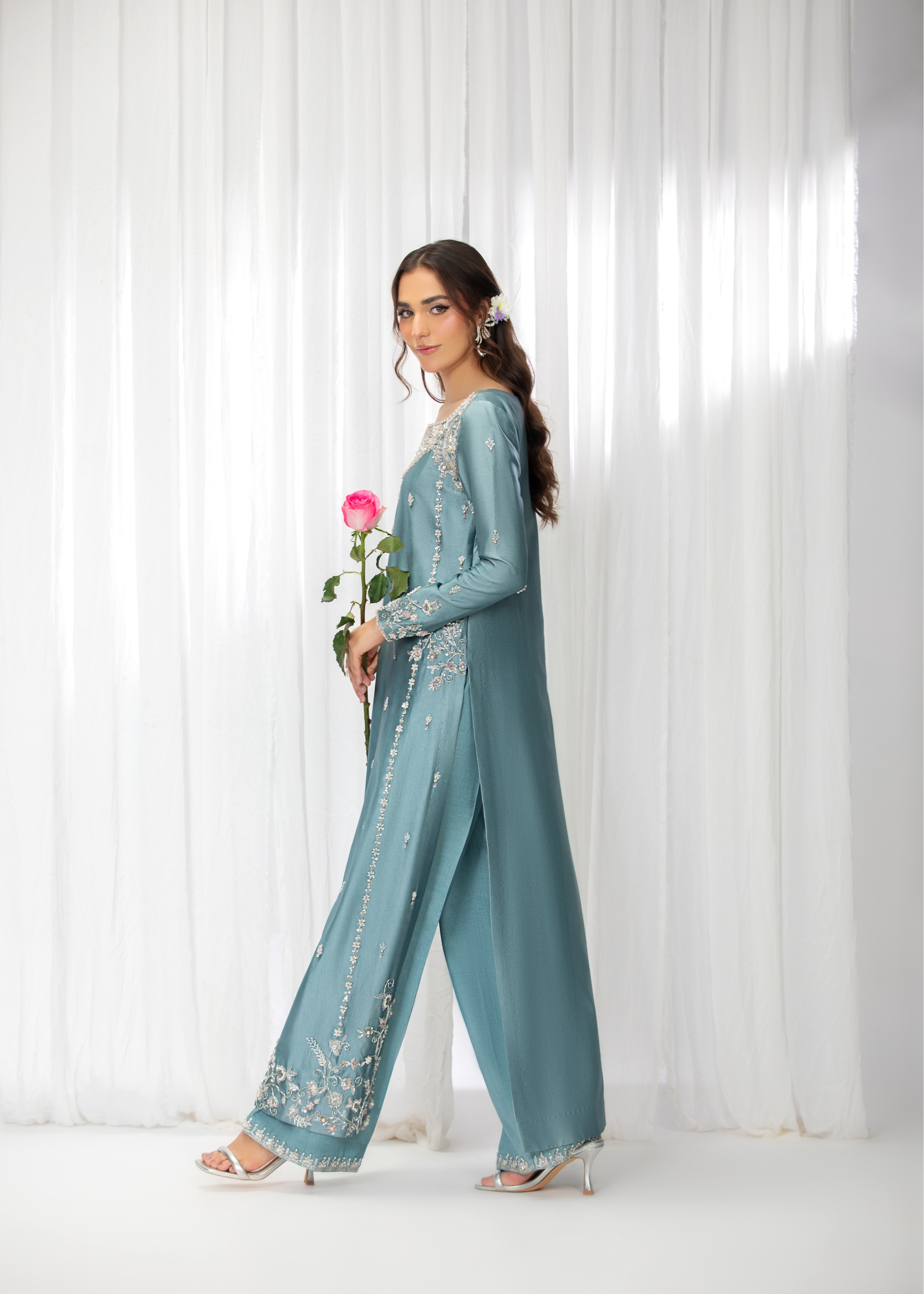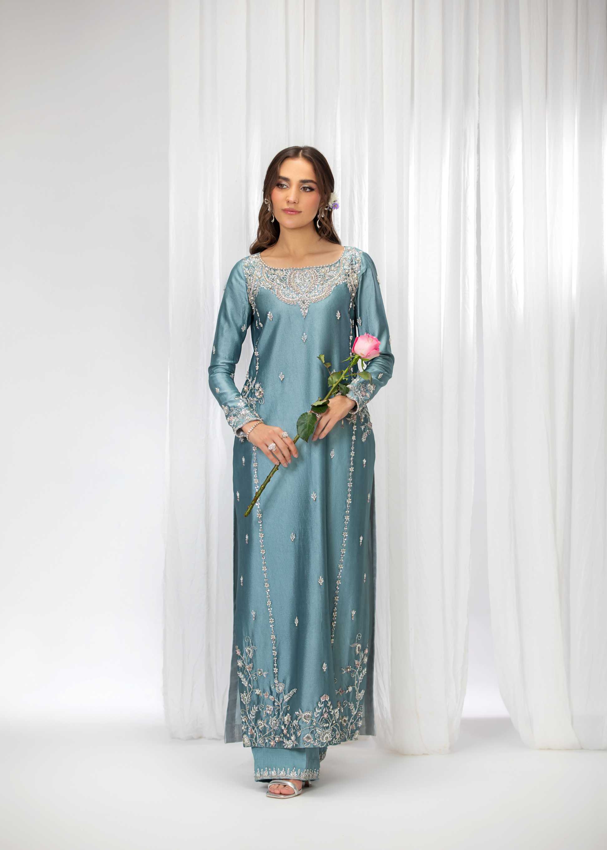 Introducing Zyra, a dazzling creation that exudes grace and refinement. Meticulously adorned with intricate naqshi and dabka, Zyra is further embellished with shimmering sequins and pearls. The design is completed with sparkling rhinestones, adding a touch of brilliance to this exquisite ensemble. Zyra is the epitome of timeless elegance, perfect for making a statement at any special occasion
